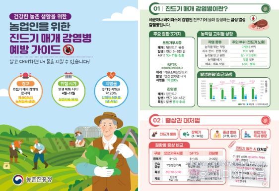 농촌진흥청은 ‘농업인을 위한 진드기 매개 감염병 예방’ 안내문을 전국 농촌진흥기관에 배포했다. 안내문에는 주요 진드기 매개 감염병 증상과 대처법, 예방 수칙 등과 감염 여부를 스스로 확인할 수 있는 자가점검표를 실었다.