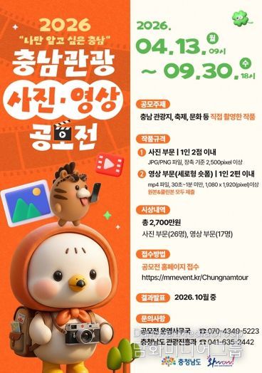 주요 홍보 내용은 △시군별 대표 축제 및 체험형 관광 프로그램 △2025∼2026년 충남 방문의 해 △2026 태안국제원예치유박람회 △충남 대표 관광명소 및 계절별 추천 여행지 △자연·휴식·미식 관광자원 등이다.