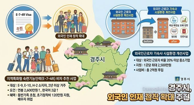 시민행정신문 강갑수 기자 | 경주시는 외국인 인재 정착을 확대하기 위해 ‘지역특화형 숙련기능인력(E-7-4R) 비자 추천 사업’과 ‘외국인 근로자 기숙사 시설환경 개선사업’을 추진한다고 19일 밝혔다.