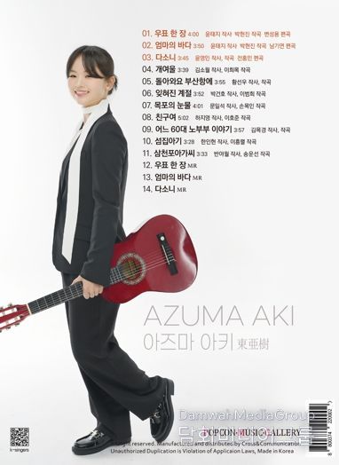아즈마 아키는 4월 앨범 발표와 동시에 팬들을 위한 화보집을 발간하며, 신곡 음원 서비스 및 방송 활동, 뮤직비디오 공개를 통해 팬들을 찾아갈 예정이다. 또한, 음반 발매를 기념해 서울과 부산을 시작으로 한 전국 콘서트 투어를 개최하며 본격적인 한국 활동을 이어갈 계획이다. 이번 앨범 작업에도 직접 참여한 삼천포아가씨가요제 이미연 대회장은 “우리 가요제 출신이자 홍보대사인 박서진과 더불어 아즈마 아키가 우리 사천이 제2의 고향이 되어 지역 홍보에 앞장설 수 있도록 많이 응원해 달라.” 고 당부했다.