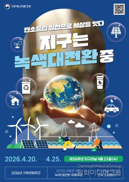 시민행정신문 김학영 기자 | 기후에너지환경부는 지구의 날(4월 22일)을 맞아 4월 20일부터 24일까지 ‘2026년 기후변화주간’을 개최한다. 올해 기후변화주간은 ‘녹색대전환 국제주간(4.20~4.25)’과 연계되어 국제사회의 탄소중립 기술과 정책, 국민의 일상 속 기후행동 실천이 함께 어우러지는 탄소중립 실천문화 확산을 위한 참여와 공감의 장이 마련될 전망이다.