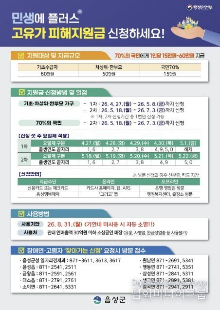 이번 지원금의 지급 대상은 올해 3월 30일 기준, 70%의 국민에게 소득 수준과 거주 지역에 따라 차등 지급한다. 특히 음성군은 비수도권으로 기초수급자 60만원, 차상위 및 한부모 50만원, 소득하위 70% 군민은 1인당 15만원을 지급받는다.
