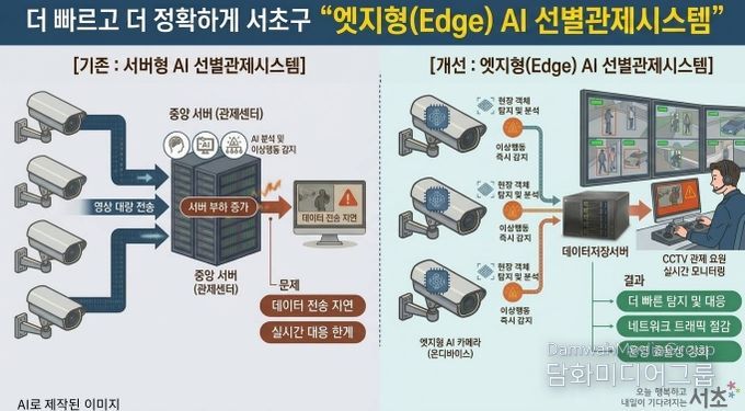 시민행정신문 강갑수 기자 | 서울 서초구가 전국 최초로 ‘엣지형 AI 선별관제시스템’을 도입해 본격 운영에 나선다고 밝혔다. AI 카메라가 현장에서 영상을 직접 분석한 뒤 선별된 정보를 관제센터로 전송하는 방식으로, 범죄·재난 등 비상상황 대응 속도와 관제 효율을 높인다는 계획이다.