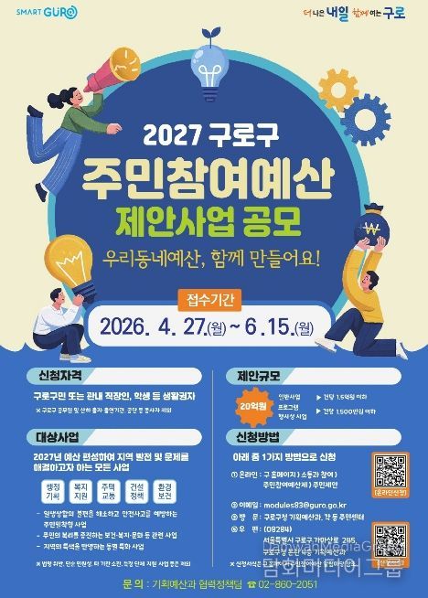 시민행정신문 강갑수 기자 | 구로구가 2027년 예산에 편성할 ‘주민참여예산 사업 공모’를 4월 27일부터 6월 15일까지 진행한다.