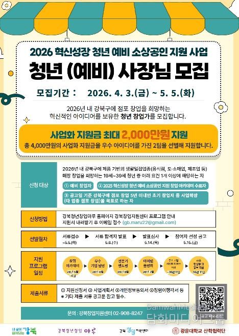 시민행정신문 강갑수 기자 | 서울 강북구는 청년 창업 활성화와 지역 상권 경쟁력 강화를 위해 ‘2026년 혁신성장 청년 예비 소상공인 지원사업’ 참여자를 모집한다고 밝혔다.