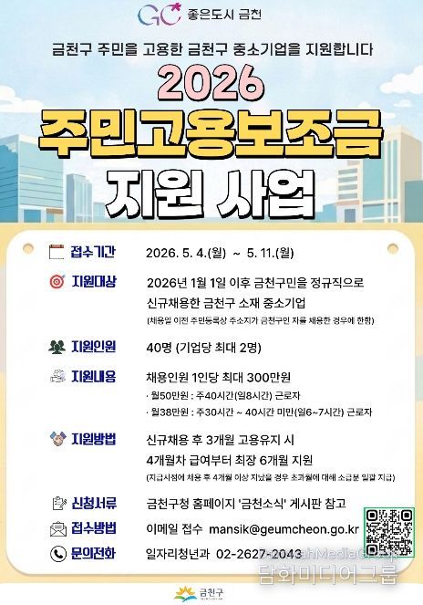 지원 대상은 2026년 1월 이후 금천구민을 정규직으로 신규 채용한 관내 중소기업이다. 기업당 최대 2명까지 신청할 수 있으며, 총 40명을 지원할 예정이다.