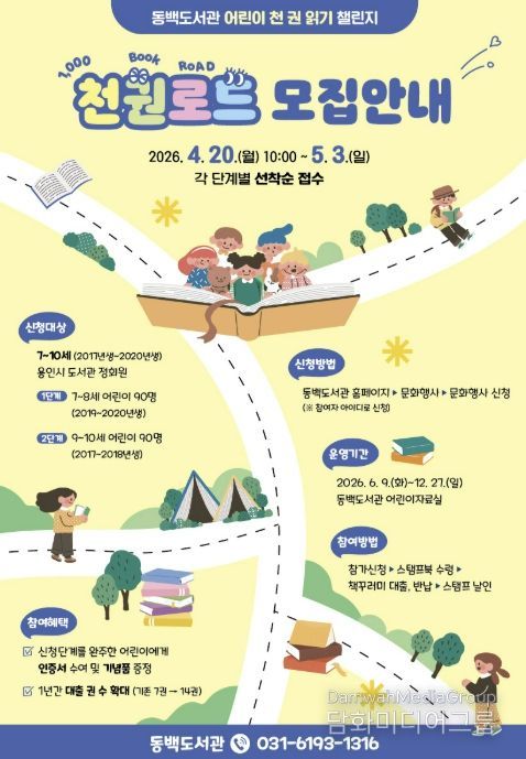 시민행정신문 강갑수 기자 | 용인특례시 동백도서관은 어린이 천 권 읽기 챌린지 ‘천권로드(ROAD)’ 참여자를 모집한다고 20일 밝혔다.