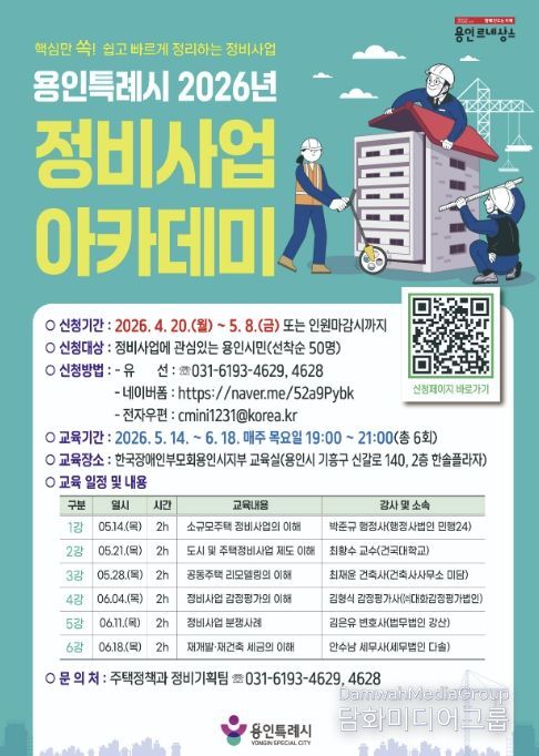 시민행정신문 강갑수 기자 | 용인특례시는 4월 20일부터 5월 8일까지 ‘2026년 정비사업 아카데미’ 수강생을 모집한다.