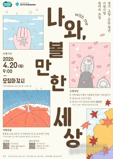 시민행정신문 강갑수 기자 | 경기도가 사회적 관계가 단절된 고립·은둔 청년의 일상 회복을 돕기 위해 20일부터 ‘경기 고립·은둔 청년 지원사업: 나와(with me), 볼만한 세상’ 참여자 300명을 모집한다.