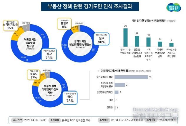 시민행정신문 강갑수 기자 | 경기도민의 78%는 현재 부동산 시장의 불법행위를 심각하게 인식하고 있으며 경기도 차원의 단속 강화 필요성에는 90% 도민이 공감한다는 조사결과가 나왔다.