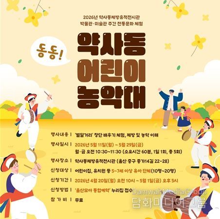 시민행정신문 강갑수 기자 | 울산 약사동제방유적전시관은 박물관·미술관 주간을 맞아 관내 어린이집과 유치원 원아를 대상으로 전통문화 체험인 ‘동동! 약사동 어린이 농악대!’를 운영한다고 밝혔다.