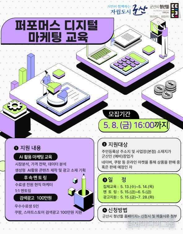 시민행정신문 이세훈 기자 | 군산시 청년뜰 창업센터가 4월 20일부터 5월 8일까지 지역 온라인 창업가의 디지털 마케팅 역량 강화를 위한 '2026년 퍼포먼스 디지털 마케팅 교육' 참여자를 모집한다.
