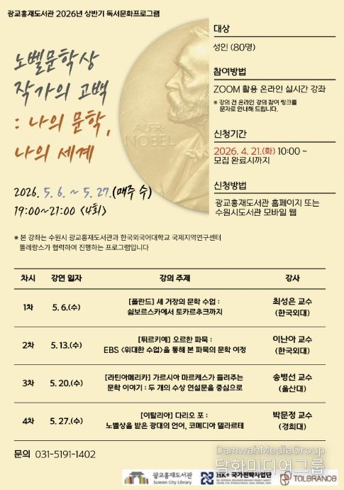 시민행정신문 강갑수 기자 | 수원시 광교홍재도서관이 한국외국어대학교와 협력해 진행하는 2026년 세계문화기행 시리즈 1편 ‘노벨문학상 작가의 고백 : 나의 문학, 나의 세계’ 강좌를 수강할 시민을 모집한다.