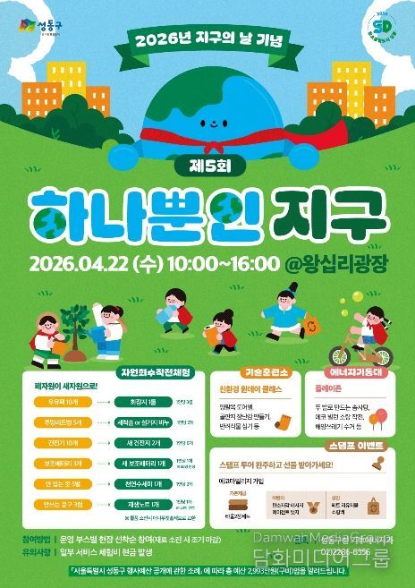 시민행정신문 이존영 기자 | 서울 성동구는 오는 4월 22일 왕십리광장에서 기후위기의 심각성을 알리고 탄소중립 실천 문화를 확산하기 위한 ‘제5회 하나뿐인 지구’ 행사를 개최한다고 밝혔다.