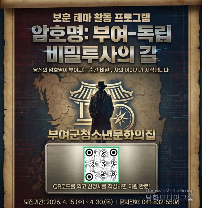 시민행정신문 강갑수 기자 | 부여군시설관리공단 청소년문화의집은 국가보훈부 공모사업에 선정된 2026년 보훈 테마 활동 프로그램 '암호명 부여-독립 비밀투사의 길'에 참여할 청소년을 4월 30일까지 모집한다.