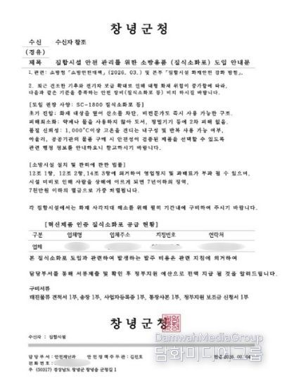 시민행정신문 강갑수 기자 | 창녕군은 공무원을 사칭해 관내 장례식장에 소방용품(질식소화포) 구매를 요구하는 보이스피싱 사례가 발생했다고 밝혔다.