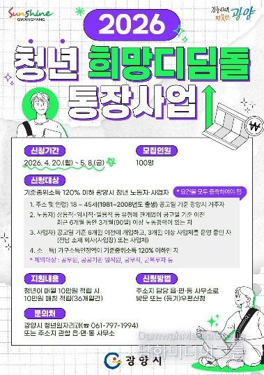 시민행정신문 강갑수 기자 | 광양시는 전라남도와 함께 청년의 자산 형성과 미래 준비를 지원하기 위해 ‘2026년 청년 희망디딤돌 통장사업’ 참여자를 모집한다고 밝혔다.