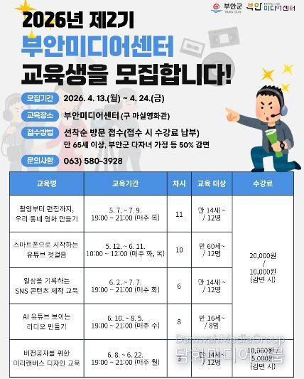 시민행정신문 강갑수 기자 | 부안미디어센터는 군민의 미디어 활용 역량 강화를 위해 2026년 제2기 미디어 교육 교육생을 모집한다고 밝혔다.