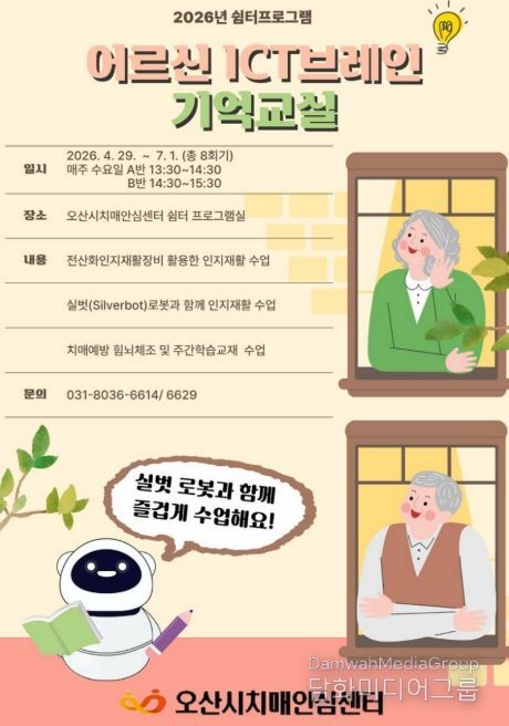 시민행정신문 기자 | 오산시치매안심센터는 오는 4월 29일부터 경증 치매환자를 위한 쉼터 프로그램 ‘ICT 브레인 기억 교실’을 운영한다고 밝혔다.