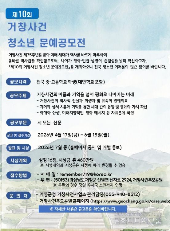 올해는 ‘거창사건의 아픔과 기억을 넘어 평화로 나아가는 미래’를 주제로 전국의 중·고등학생(대안학교 포함)은 누구나 시와 산문 부문에 응모할 수 있으며 시상금은 총 460만 원이다.