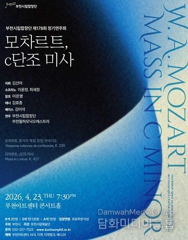 시민행정신문 기자 | 부천시립합창단이 오는 4월 23일 오후 7시 30분 부천아트센터 콘서트홀에서 제178회 정기연주회 ‘모차르트, c단조 미사’를 개최한다. 이번 공연은 김선아 상임지휘자의 지휘 아래 소프라노 이윤정, 최세정, 알토 이은영, 테너 김효종, 베이스 김이삭이 협연자로 무대에 오르며, 부천시립합창단과 부천필하모닉오케스트라, 구민아(오르간)가 함께한다.