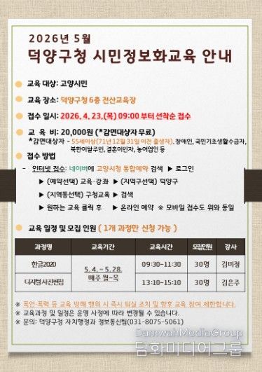 교육은 5월 4일부터 28일까지 덕양구청 전산교육장에서 진행되며, 수강 신청은 4월 23일 오전 9시부터 덕양구청 통합예약 누리집을 통해 온라인으로 접수할 수 있다.