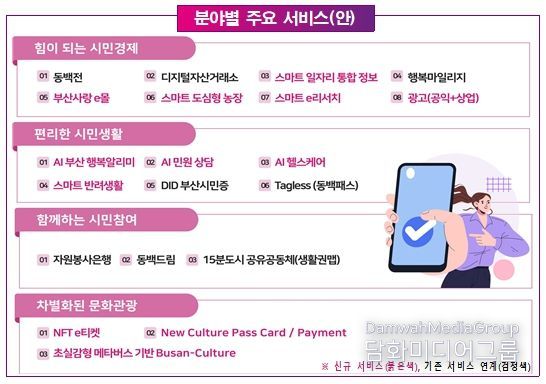 주요 서비스로는 ▲개인별 맞춤형 혜택을 알려주는 ‘인공지능(AI) 부산행복알리미’ ▲생성형 인공지능(AI) 기반의 ‘인공지능(AI)민원상담’ ▲개인 건강관리 ‘인공지능(AI) 헬스케어’ ▲‘스마트 일자리 통합 정보’ ▲‘스마트 반려생활’ ▲‘부산사랑e몰’ 등 디지털 지갑 기능을 포함한 20여 개 서비스를 하나의 앱에서 제공한다.