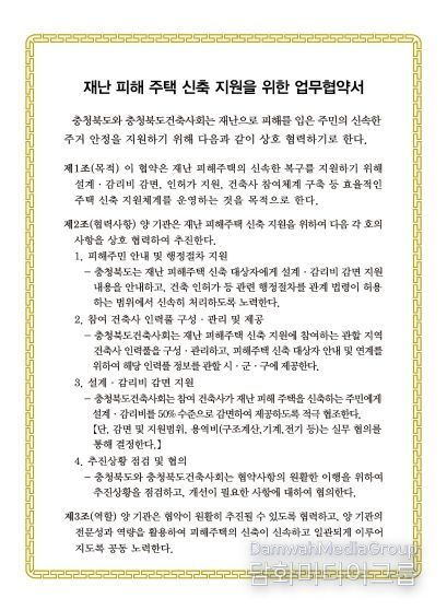 협약에 따라 도는 신속한 인·허가 등 관련 행정절차 처리를 협조하고, 충북건축사회는 설계·감리비의 최대 50% 수준 감면 및 전문 지원체계 구축 등 피해 도민은 즉각적인 기술 자문과 설계를 지원받을 수 있는 체계를 운영한다.
