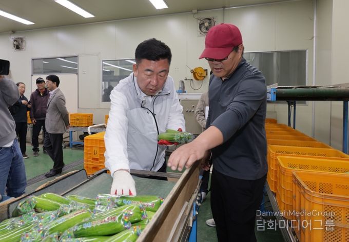 시민행정신문 강갑수 기자 | 이범석 청주시장은 20일 흥덕구 오송읍에 위치한 청원생명 애호박 공동선별장을 방문해 공선 및 유통 현황을 점검하고 관계자와 지역 농민들을 격려했다.