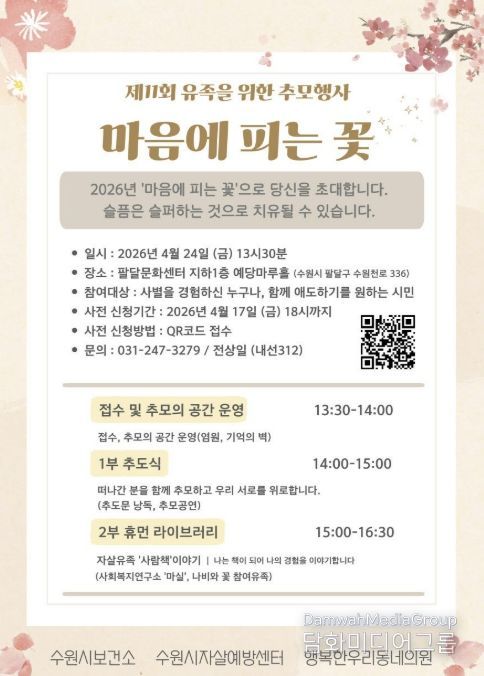 시민행정신문 기자 | 수원시자살예방센터가 24일 오후 1시 30분 팔달문화센터 예당마루홀에서 유족을 위한 추모행사 ‘제11회 마음에 피는 꽃’을 연다.