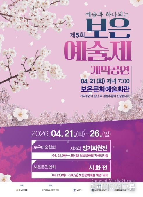 이경숙 문화관광과장은 “이번 보은예술제가 군민들이 일상 속에서 문화와 예술을 가까이에서 즐기고 공감할 수 있는 시간이 되길 바란다”며 “다양한 전시와 공연이 어우러진 이번 행사가 지역에 따뜻한 활력을 더하길 기대한다”고 말했다.