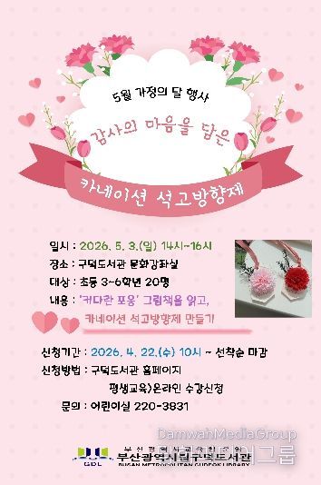 시민행정신문 기자 | 부산광역시립구덕도서관은 다음달 3일 도서관 문화강좌실에서 초등학교 3~6학년 20명을 대상으로 ‘감사의 마음을 담은 카네이션 석고방향제’ 체험을 운영한다.