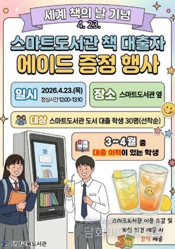 이번 행사에서는 3~4월 중 스마트도서관에서 책을 대출한 학생 선착순 30명을 대상으로 시원한 에이드 음료를 제공한다.