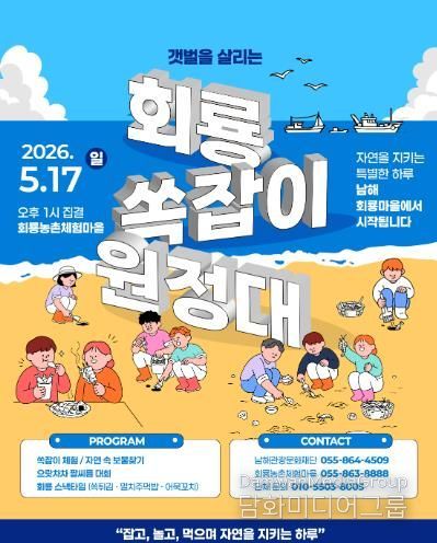 시민행정신문 강갑수 기자 | 남해관광문화재단은 ‘2026 지역민 주도 소규모 축제 개최 지원 사업’의 일환으로 오는 5월 17일 일요일 오후 1시 ‘갯벌을 살리는 회룡 쏙잡이 원정대’ 축제를 개최한다.