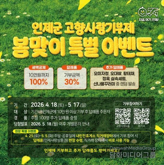 김장웅 인제군 지역발전과장은 “봄철 인제군을 찾는 방문객들에게 고향사랑기부제를 자연스럽게 알리고 참여를 독려하기 위해 이번 이벤트를 마련했다”며, “고향을 사랑하는 마음으로 기부하고 세액공제와 답례품 혜택은 물론, 지역 농특산물 소비 활성화에도 동참하는 뜻깊은 기회가 되길 바란다”고 말했다.