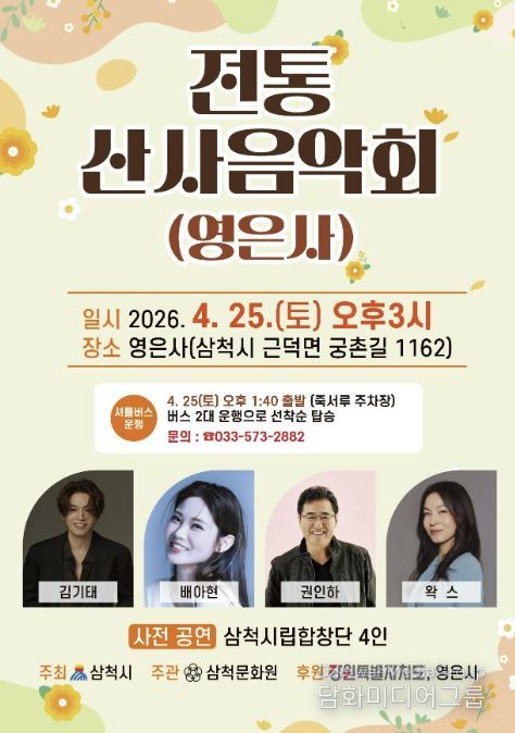 시민행정신문 기자 | 삼척시는 4월 25일 근덕면 영은사에서 자연과 전통이 어우러진 '전통 산사 숲속 음악회'를 개최한다고 밝혔다.