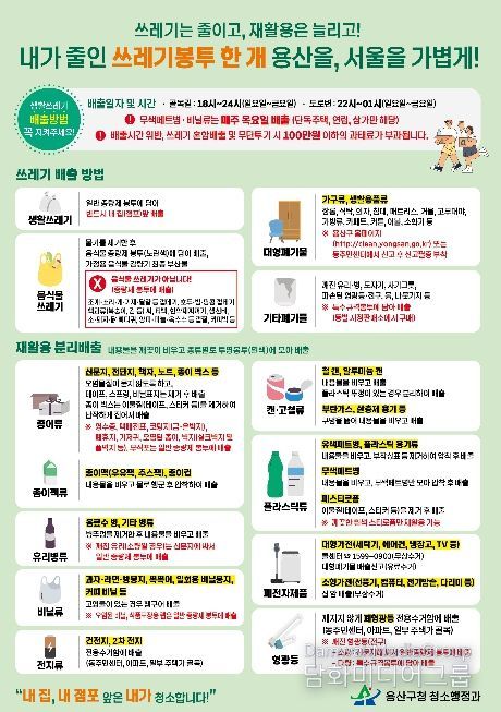 시민행정신문 강갑수 기자 | 서울 용산구가 주민 누구나 생활쓰레기 분리배출 정보를 쉽게 이해하고 실천할 수 있도록 주요 배출 정보를 한 장에 담은 안내문을 제작·배포한다.