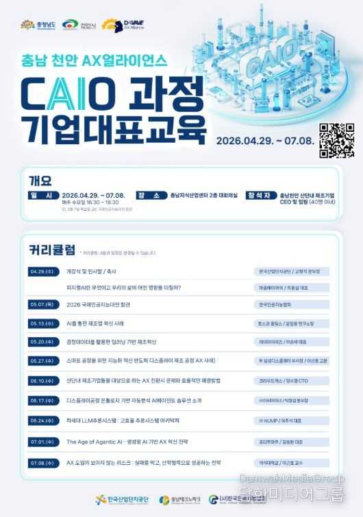 천안시는 산업단지 제조기업 CEO 및 임원을 대상으로 현장 맞춤형 AI 전략을 전수하는 ‘충남·천안 AX얼라이언스 CAIO(Chief AI Officer) 과정 기업대표교육’을 운영한다고 21일 밝혔다.
