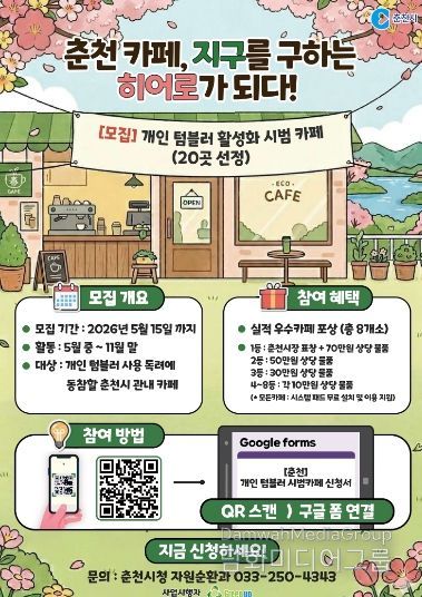 모집 기간은 5월 15일까지다. 선정된 카페는 5월 중순부터 11월 말까지 약 6개월간 시범사업에 참여하게 된다. 참여 대상은 개인 텀블러 사용 권장 등 친환경 실천에 동참할 의사가 있는 춘천시 지역 내 카페다.