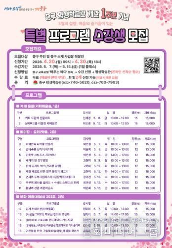중구 관계자는 “중구 평생학습관 개관 1주년을 맞아 구민을 위한 다채로운 특강을 마련했다”라며 “앞으로도 다양한 평생교육 기회 제공과 교육 접근성 제고 등을 통해 구민 삶의 질 향상에 주력할 것”이라고 밝혔다.