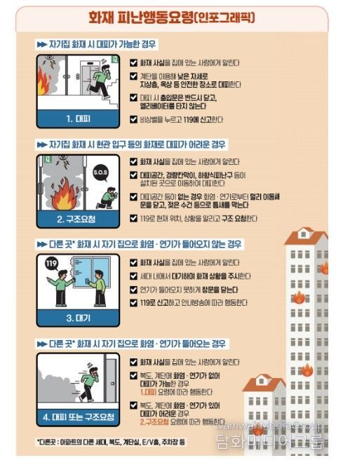 시민행정신문 강갑수 기자 | 소방청은 최근 아파트 화재가 잇따라 발생함에 따라, 인명피해를 최소화하기 위해 무리한 대피보다는 화재 상황을 먼저 판단하고 행동하는 상황별 피난 행동요령을 철저히 준수해 줄 것을 당부한다고 17일 밝혔다.