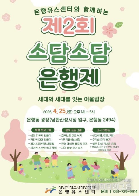 시민행정신문 기자 | 성남시청소년청년재단 은행유스센터는 오는 4월 25일 오후 1시부터 5시까지 은행동 광장에서 청소년과 지역 주민이 함께하는 ‘제2회 소담소담 은행제’를 개최한다.
