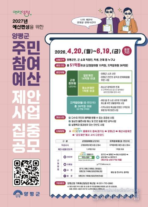 시민행정신문 강갑수 기자 | 양평군은 오는 6월 19일까지 2027년 예산에 반영할 ‘주민참여예산 제안사업’을 집중 공모한다고 밝혔다.