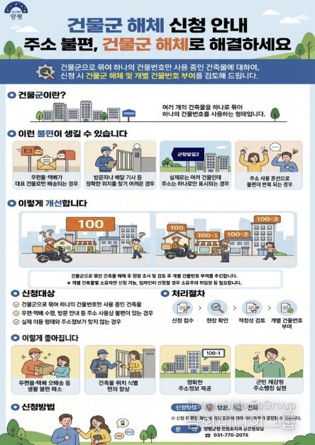 건물군은 여러 개의 건축물을 하나로 묶어 동일한 건물번호를 부여·관리하는 방식이다. 그러나 건물군 내 여러 거주자와 이용자가 있음에도 하나의 건물번호만 사용함에 따라 우편물과 택배, 소포 등이 대표 건물로 집중되는 사례가 발생하고 있다. 이로 인해 등기 반송, 택배 오배송, 방문객 안내 지연 등 생활 속 불편이 지속돼 왔다. 또한 실제로는 서로 다른 건축물임에도 주소상 동일한 건물번호를 사용함으로써 위치 식별이 어렵고, 응급상황이나 안전사고 발생 시 신속한 대응에도 어려움이 있었다.