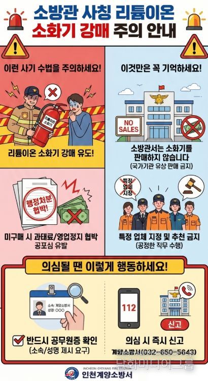 시민행정신문 강갑수 기자 | 계양소방서는 최근 소방공무원을 사칭해 리튬배터리용 소화기 등 물품 구매를 요구하는 사기 행위가 발생하고 있다며 시민들의 각별한 주의를 당부했다.