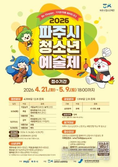 시민행정신문 기자 | (재)파주시청소년재단 금촌청소년문화의집은 오는 4월 21일부터 5월 9일까지 ‘2026 파주시청소년예술제’ 참가자를 모집한다고 밝혔다. 올해‘Be Happy, 무대위에 피어나다’를 부제로 개최되는 이번 예술제는 제34회 경기도청소년예술제 파주시 공식 예선으로, 파주시 청소년이라면 누구나 참가 신청이 가능하다.