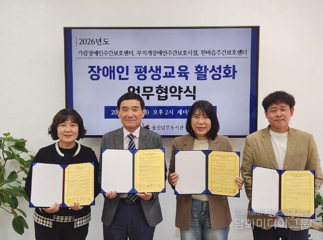 시민행정신문 기자 | 울산 남부도서관은 21일 도서관 세미나실에서 가람장애인주간보호센터, 무지개장애인주간보호시설, 한마음주간보호센터와 장애인 평생학습 활성화 업무협약을 체결했다.