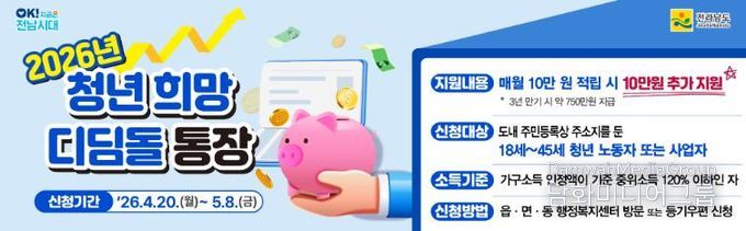 윤연화 전남도 인구청년이민국장은 “청년 희망디딤돌 통장은 일하는 청년이 안정적으로 목돈을 마련하도록 돕는 대표적 자산형성 정책”이라며 “앞으로도 청년의 지역 정착과 자립을 지원하는 맞춤형 정책을 지속해서 확대하겠다”고 말했다.