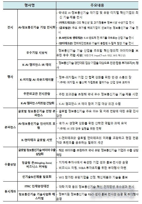 또한, 올해 처음으로 다양한 전문 프로그램도 운영된다. ‘인공지능·정보통신기술 통찰력 토론회(인사이트 포럼)’에서는 인공지능 3대 강국 도약을 위한 정책·기술 전략을 산·학·연 전문가들과 함께 논의하고, ‘한국형 물리적 인공지능 원탁회의(K-피지컬 AI 라운드테이블)’에서는 정부와 기업이 참여하여 산업 현장 중심의 물리적 인공지능(피지컬 AI) 기술 발전 방향과 협력 방안을 모색한다. 아울러, ‘한국형 융합 콘텐츠 기술 세계 정상회의(K-엔터테크 글로벌 서밋)’에서는 K-콘텐츠와 인공지능 기술의 융합 사례를 기반으로 세계 시장 진출 전략과 사업 모델을 공유할 예정이다.