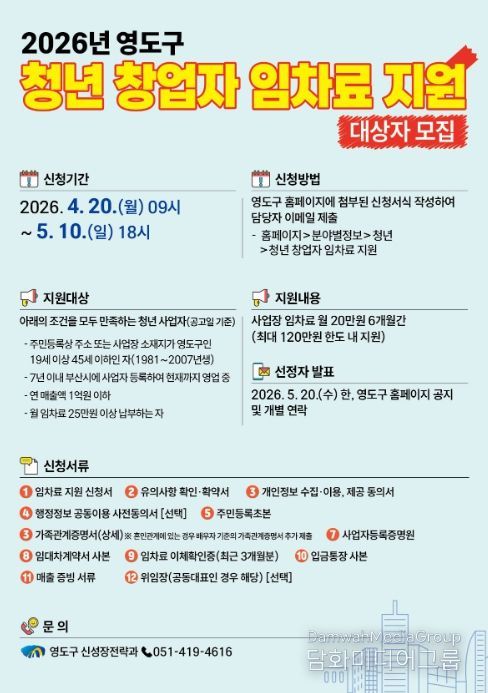 시민행정신문 이세훈 기자 | 부산 영도구는 청년 창업가들의 경제적 부담을 덜어주고 지역 내 안정적인 사업 기반 마련을 돕기 위해 지난해에 이어 '2026년 청년 창업자 임차료 지원사업' 참여자를 모집한다고 밝혔다.